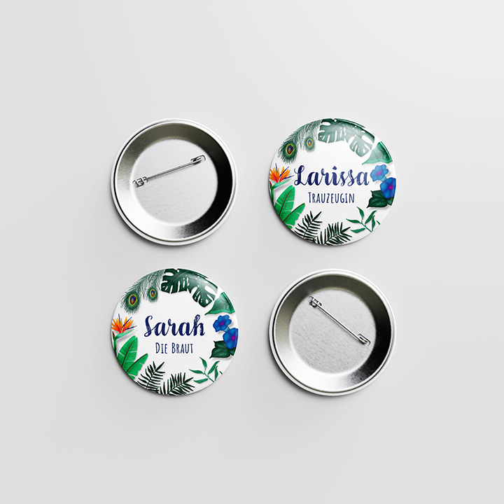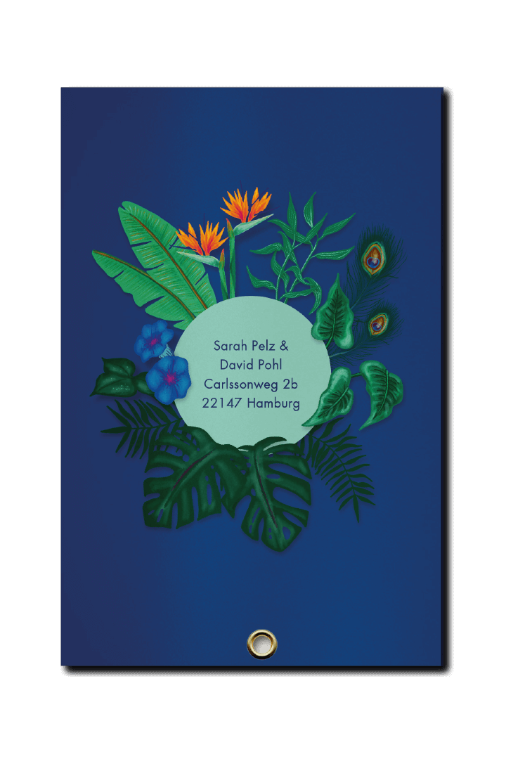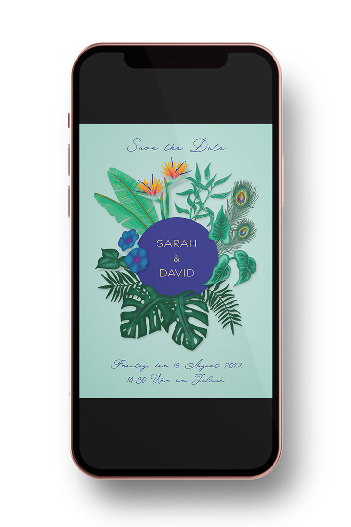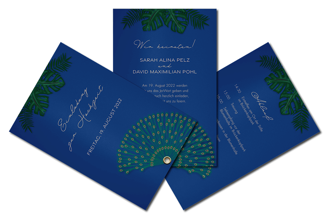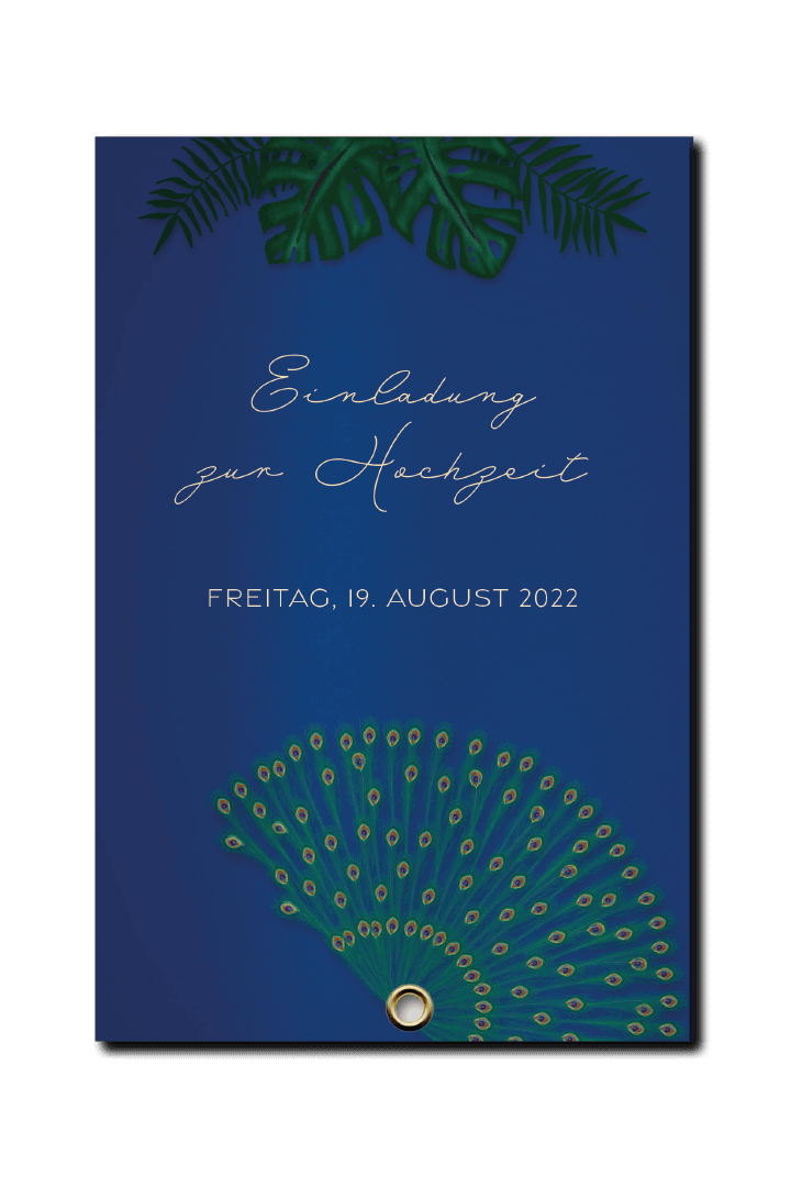 Passend zur Location und Tischdekoration zeigt diese tropische Hochzeitseinladung beim Öffnen ein Pfauenrad. Die sechsseitige Fächerkarte wurde auf 290g/m² Karton mit Metallic Effekt gedruckt. Die Save-the-Date-Karte wurde digital an die Gäste gesendet.